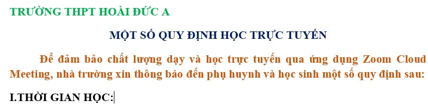 Để đảm bảo chất lượng dạy và học trực tuyến qua ứng dụng Zoom Cloud Meeting, nhà trường xin thông báo đến phụ huynh và học sinh một số quy định sau: