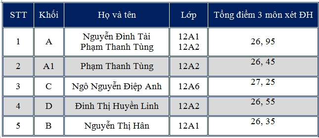 Sáng ngày 14/7/2019, Bộ Giáo dục đã công bố điểm thi THPT Quốc Gia năm 2019. Theo căn cứ đó, Trường ta đã đạt kết quả thật tuyệt vời. Trên 400 học sinh có điểm trung bình 3 môn xét ĐH là trên 20 điểm. Đặc biệt số thí sinh có tổng điểm 3 môn xét ĐH trên 26 là 13. Tổng điểm trên 24 có hơn 70 học sinh. Trong đó thủ khoa các khối của trường ta như sau: