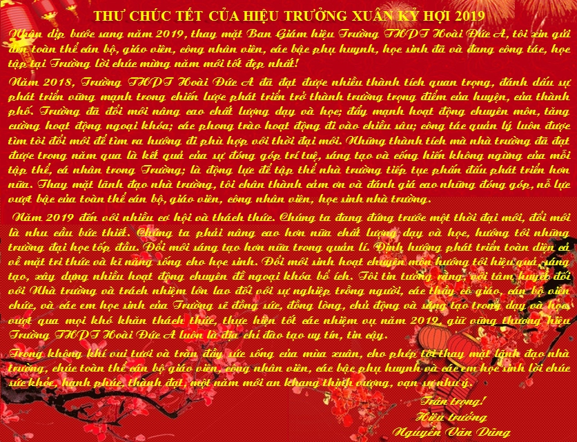 Năm 2019 đến với nhiều cơ hội và thách thức. Chúng ta đang đứng trước một thời đại mới, đổi mới là nhu cầu bức thiết. Chúng ta phải nâng cao hơn nữa chất lượng dạy và học, hướng tới những trường đại học tốp đầu. Đổi mới sáng tạo hơn nữa trong quản lí. Định hướng phát triển toàn diện cả về mặt tri thức và kĩ năng sống cho học sinh. Đổi mới sinh hoạt chuyên môn hướng tới hiệu quả, sáng tạo, xây dựng nhiều hoạt động chuyên đề ngoại khóa bổ ích. Tôi tin tưởng rằng, với tâm huyết đối với Nhà trường và trách nhiệm lớn lao đối với sự nghiệp trồng người, các thầy cô giáo, cán bộ viên chức, và các em học sinh của Trường sẽ đồng sức, đồng lòng, chủ động và sáng tạo trong dạy và học, vượt qua mọi khó khăn thách thức, thực hiện tốt các nhiệm vụ năm 2019, giữ vững thương hiệu Trường THPT Hoài Đức A luôn là địa chỉ đào tạo uy tín, tin cậy.