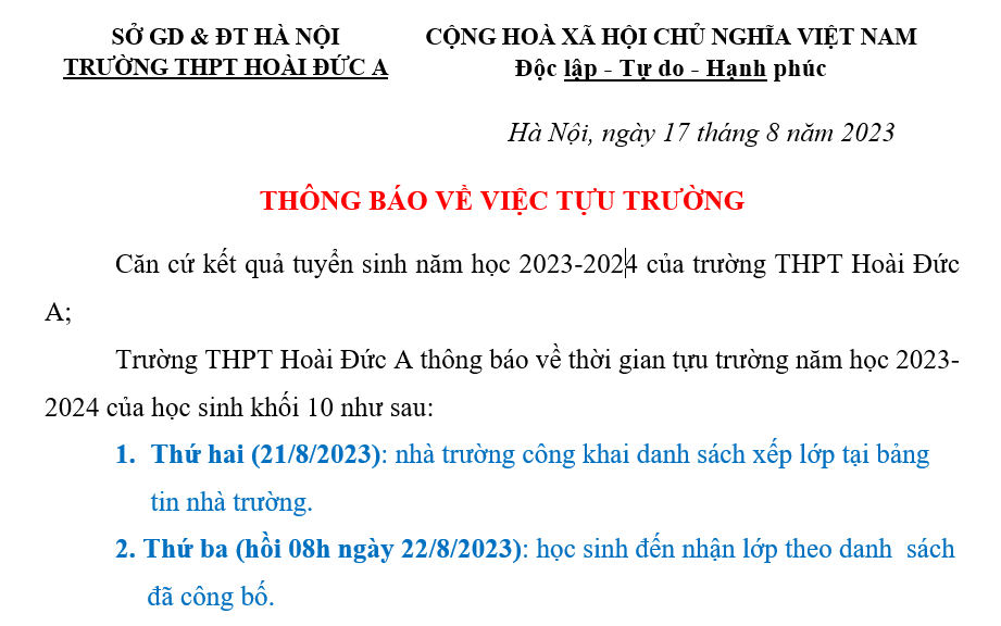 Trường THPT Hoài Đức A thông báo về
