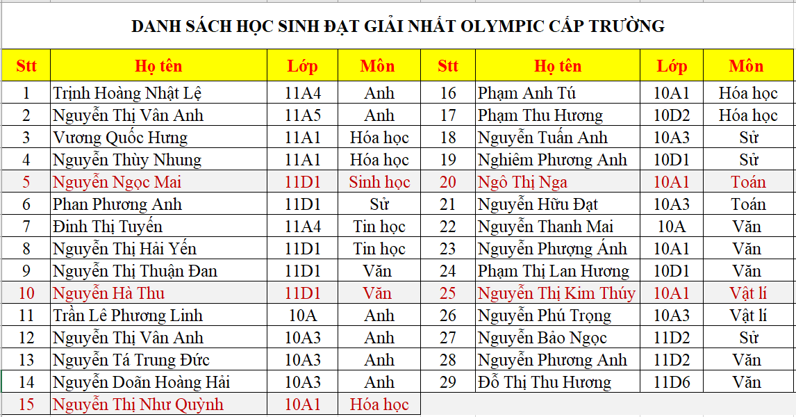 Danh sách các học sinh đạt thành tích xuất sắc trong kì thi học sinh giỏi cấp trường khối sáng: