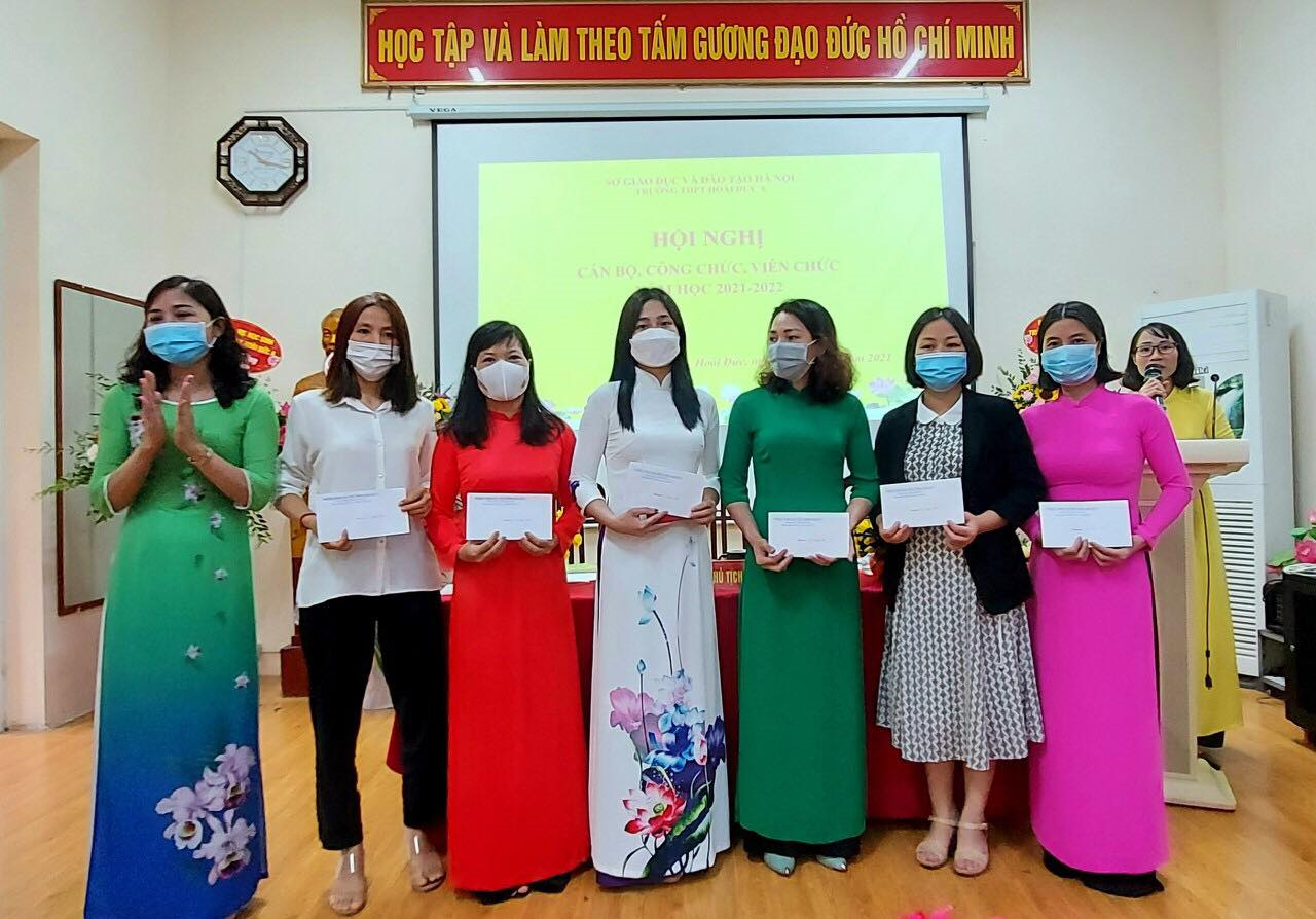 Tiếp theo phần thảo luận là phần khen thưởng các tập thể cá nhân có thành tích xuất sắc trong năm học 2020- 2021. Về thành tích tập thể có 02 tập thể đạt danh hiệu Tập thể lao động tiên tiến: Tập thể nhà trường và tổ Ngữ văn. Về thành tích cá nhân, các thầy cô đã vinh dự được tặng bằng khen, giấy khen của thành phố, của sở giáo dục và đào tạo Hà Nội. Đồng chí Nguyễn Bá Tài, Phó Hiệu trưởng nhà trường được Công Đoàn ngành tặng Giấy khen 5 năm thực hiện Chỉ thị 05-CT/TW của Bộ Chính trị về học tập và làm theo tư tưởng, đạo đức, phong cách Hồ Chí Minh giai đoạn 2015-2020. Đồng chí Nguyễn Hoài Hương được Liên đoàn lao động Thành phố tặng Bằng khen có nhiều đóng góp xuất sắc trong năm học 2020-2021. Gia đình đồng chí Nguyễn Thị Vân được công đoàn ngành tặng giấy khen. Các cố gắng nỗ lực của các tập thể, cá nhân đã góp phần tạo nên bề dày truyền thống vẻ vang của nhà trường.