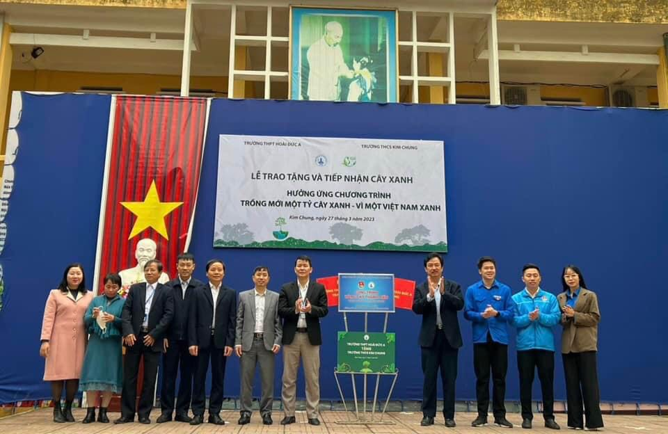 Nhằm hưởng ứng chương trình “Trồng mới một tỷ cây xanh - Vì một Việt Nam xanh” nhân dịp Kỷ niệm 92 năm ngày Thành lập Đoàn TNCS Hồ Chí Minh (26/03/1931 – 26/03/2023). Được sự đồng ý của Phòng GD&ĐT huyện Hoài Đức, sáng ngày hôm qua (27/3/2023), trường THCS Kim Chung phối hợp với trường THPT Hoài Đức A đã tổ chức thành công Lễ Trao tặng và Tiếp nhận Cây xanh với sự góp mặt của các cấp lãnh đạo từ Phòng GD&ĐT Hoài Đức; UBND, Đoàn xã Kim Chung; Ban Giám Hiệu và Đoàn thanh niên trường THPT Hoài Đức A cùng phòng viên đến từ Đài truyền thanh huyện Hoài Đức và toàn thể các Cán bộ, giáo viên, nhân viên trường THCS Kim Chung.