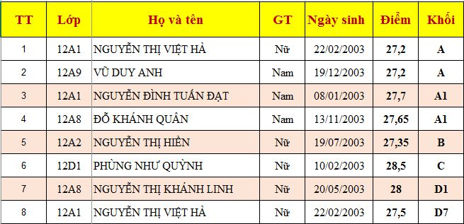 Danh sách các học sinh có điểm trung bình ba môn xét tuyển ĐH từ 24 điểm trở lên: