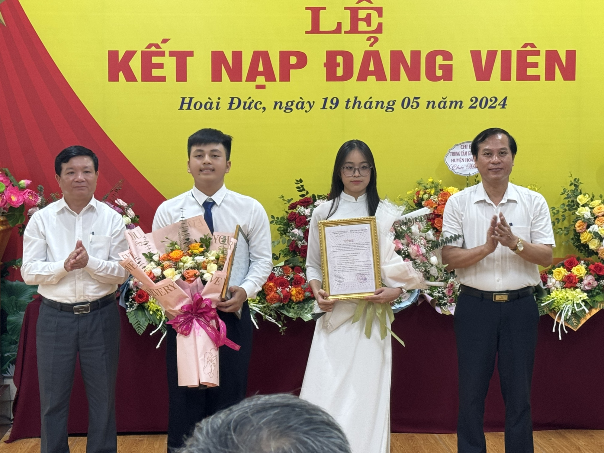 Vào sáng ngày 19/05/2024, Chi bộ trường THPT Hoài Đức A đã long trọng tổ chức lễ kết nạp Đảng viên cho 2 đồng chí ưu tú Đỗ Đức Sơn (12A-K55) và Phạm Thị Lan Hương (12D1-K55) đang công tác học tập tại trường. Đây thực sự là sự kiện vô cùng đặc biệt, ghi dấu ấn sâu sắc trong lịch sử nhà trường, đồng thời truyền động lực vô cùng lớn lao cho những thế hệ học sinh tiếp theo về những tấm gương ưu tú, bước vào hàng ngũ của Đảng khi còn ngồi trên ghế nhà trường.
