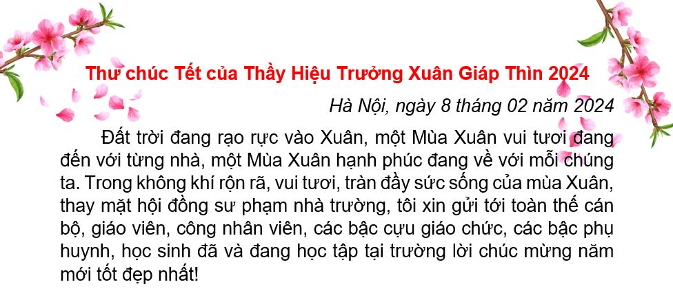 Kính thưa toàn thể các thầy cô giáo, các bậc phụ huynh và các em học sinh thân mến! Tết nguyên đán Giáp Thìn đang đến rất gần, đón Tết cổ truyền của dân tộc, một lần nữa, cho phép tôi thay mặt lãnh đạo nhà trường, chúc toàn thể cán bộ, giáo viên, công nhân viên, các bậc cựu giáo chức, các bậc phụ huynh và các em học sinh, một năm mới tràn ngập niềm vui, an khang, thịnh vượng, vạn sự như ý !