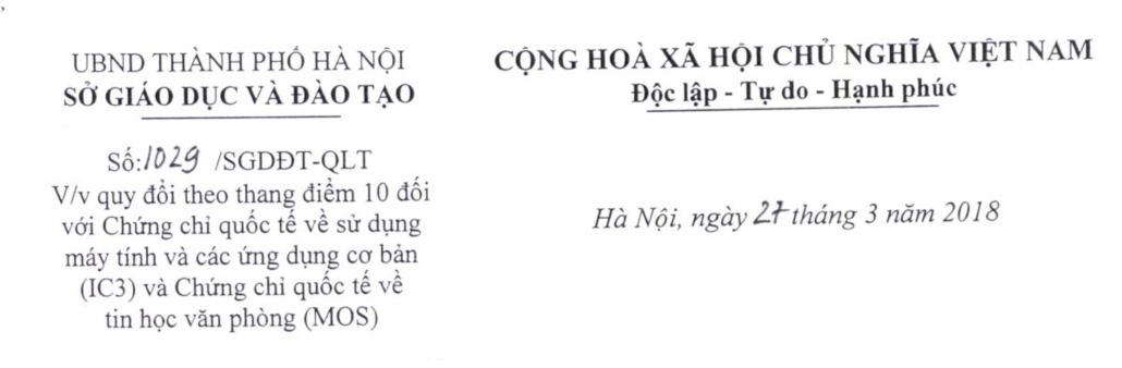 Căn cứ Công văn số 1029/SGDĐT-QLT ngày 27/3/2018 về việc Quy đổi theo thang điểm 10 đối với chứng chỉ quốc tế về tin học văn phòng ( MOS). Sở GDĐT hướng dẫn các đơn vị có học sinh đã dự thi và được cấp chứng chỉ quốc tế về tin học văn phòng (MOS) lập danh sách đề nghị quy đổi từ chứng chỉ quốc tế MOS sang chứng chỉ nghề phổ thông, cụ thể như sau: